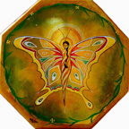 Our designs are hand-silk screened, using non-toxic inks guaranteed not to chip, fade, scratch or impair the drum's superb tone. Our drums are radiantly beautiful, portable, affordable and easy for a beginner to play. A perfect gift for all ages, they are an outstanding musical instrument, a beautiful wall hanging, an authentic (signed) Native American craft item, and an important wellness tool. |